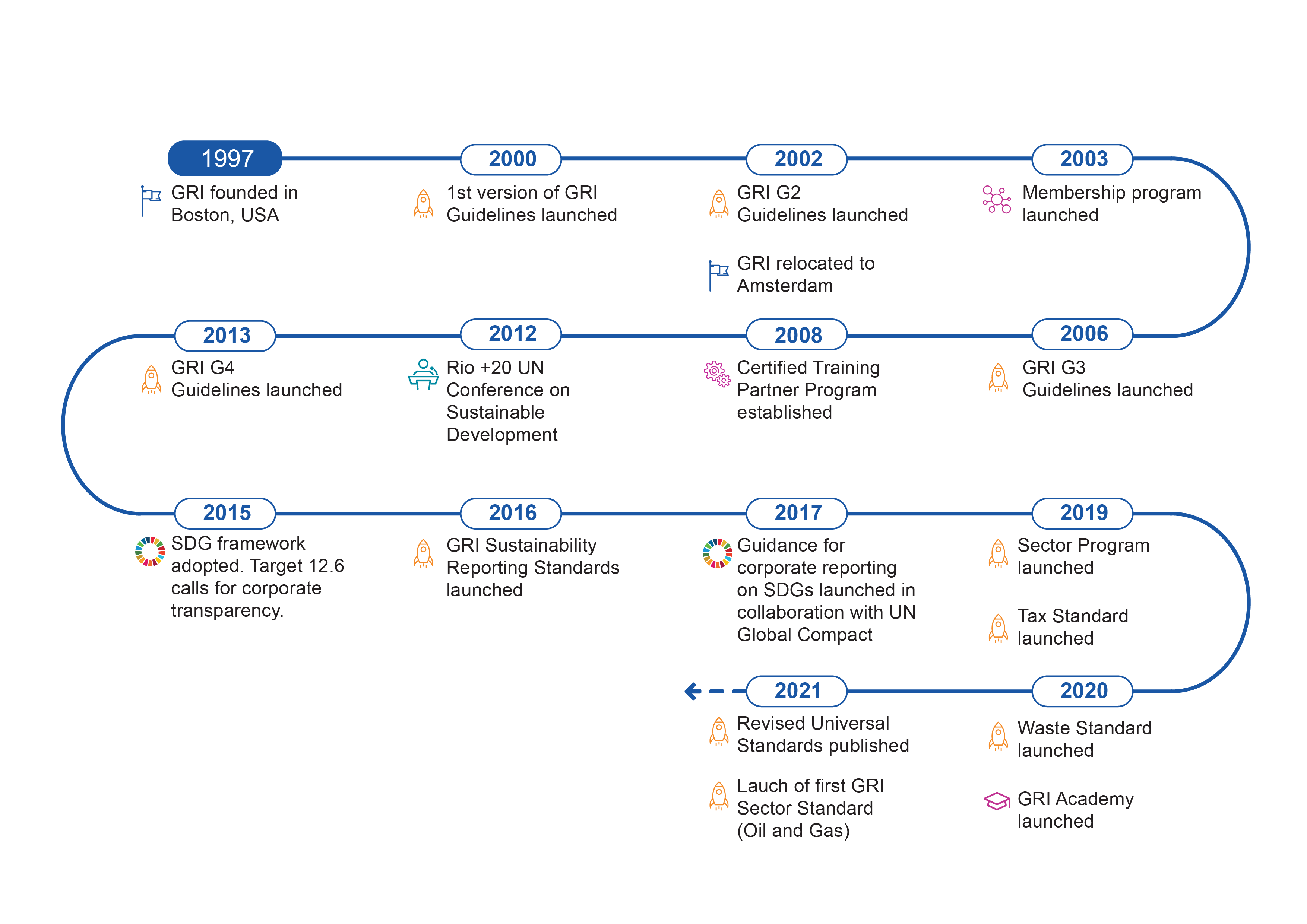 The first version of what was then the GRI Guidelines (G1) published in 2000 – providing the first global framework for sustainability reporting. The following year, GRI was established as an independent, non-profit institution. In 2002, GRI relocated to Amsterdam, The Netherlands, and the first update to the guidelines (G2) launched. As demand for GRI reporting and uptake from organizations steadily grew, the guidelines were expanded and improved, leading to G3 (2006) and G4 (2013).